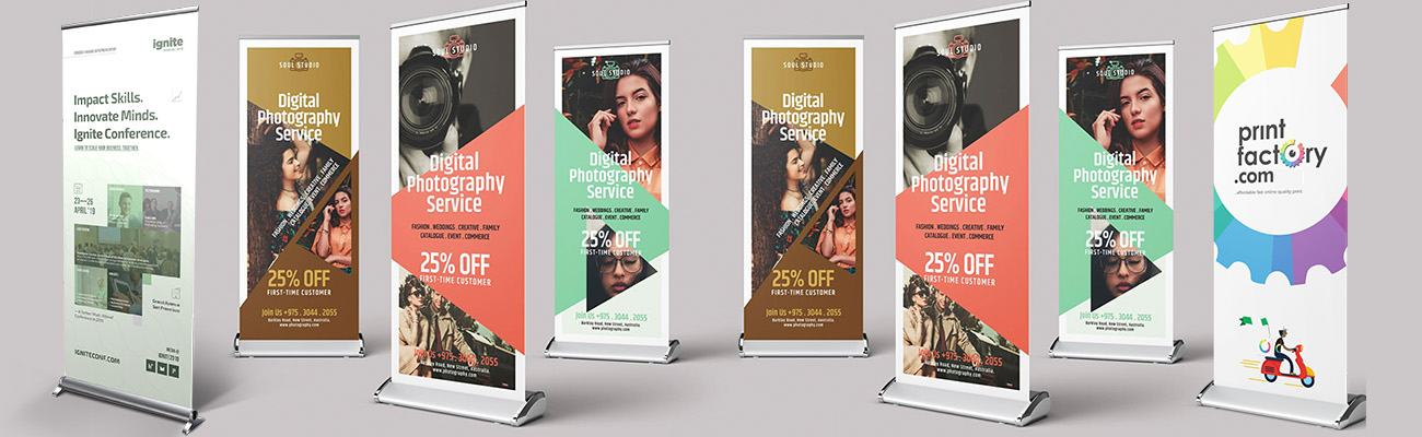 Custom roller banners make the most of your time and money at trade shows, conferences or in-shop events. This set – aluminum base, banner and carrying case – comes preassembled for an easy and efficient set-up. It’s a great way to draw attention to your stand or display, especially when you are working in a crowded room.